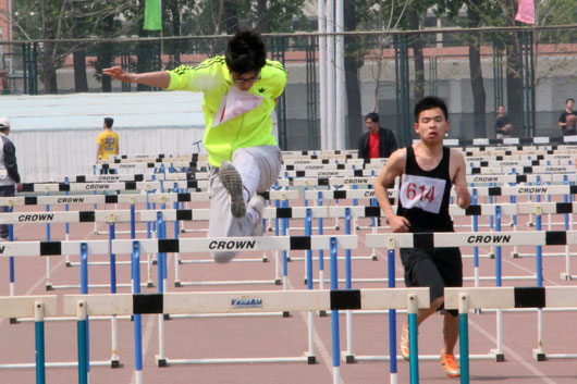 刘永强同学取得了第三名的优异成绩,在采访中,他表示,对于跨栏比赛,因为没有参加过专业训练,所以赛前对赛道上的10个栏感到很恐惧,自己在课下也特意小心地练习过,在比赛时抛开杂念,只看着前方的栏和不远处的终点,顺利到达终点。