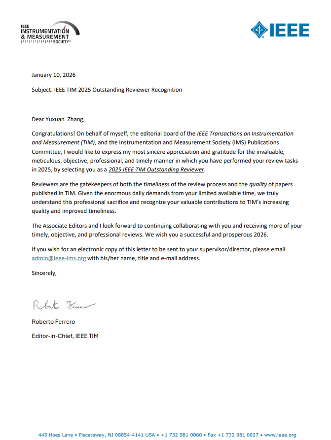 物联网系张宇轩老师“2025年度杰出审稿人奖(Outstanding Reviewersof 2025)”,以表彰其高质量、建设性和及时的审稿工作。该奖项是TIM期刊编辑团队综合审稿人对期刊投稿文章提出及时细致的专业评判与修改建议,为了鼓励审稿人为维持高水平期刊所做的贡献而颁布。其他获奖者分别来自香港城市大学、英国曼彻斯特大学、天津大学、北京航空航天大学和清华大学等院校。特此向张宇轩老师表示祝贺!